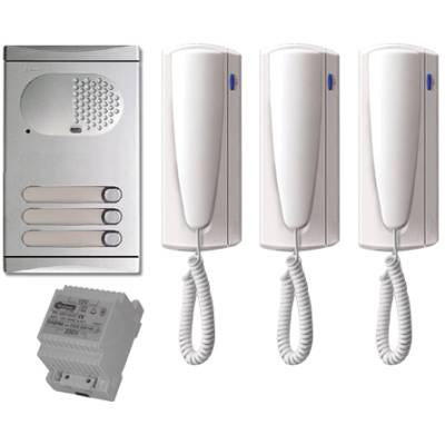 Háromlakásos audio kaputelefon szett, mely tartalmaz mindent, ami a kaputelefon felszereléséhez szükséges. Moduláris felépítésű, ezért bármikor egyszerűen kiegészíthető, bővíthető például nagyobb lakásszámúra, kódzáras ajtónyitásra. Az erős, alumínium szerkezetű kültériegység a szükséges kiegészítőkkel falonkívül, süllyesztve és esővédővel is elhelyezhető. A nyomógombok mellett megvilágított névtáblával rendelkezik. Az esztétikus lakáskészülékekhez még két kiegészítő lakáskészüléket csatlakoztathat párhuzamosan mindegyik lakásban, melyekről gombnyomással kaput is nyithatnak.