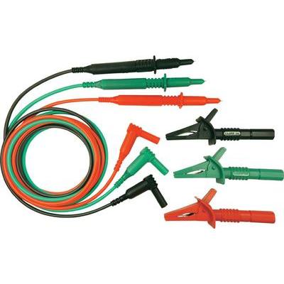 Anyag: Szilikon · Csatlakozó típus A (illetve bemenetek): Dugó, 4 mm · Csatlakozó típus B (illetve kimenetek): Vizsgáló hegy · Dugó jellemők: Érintésbiztos,Hajlított,Merev · Kábel típus: Biztonsági mérővezeték készlet · Kábelhossz: 1.50 m · Mérési kategória: CAT III 1000 V · Névleges feszültség: 1000 V · Névleges áram: 10 A · Szín: Zöld,Piros,Fekete